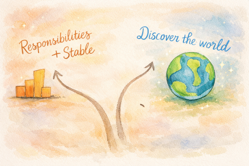 Điều đó không chỉ có nghĩa là mình cần có trách nhiệm hơn và trở nên ổn định hơn, mà còn là mình nhận ra rằng mình không còn quá trẻ để cứ chậm rãi khám phá thế giới nữa. Vì vậy mình cảm thấy mình cần phải đi nhanh hơn một chút.
